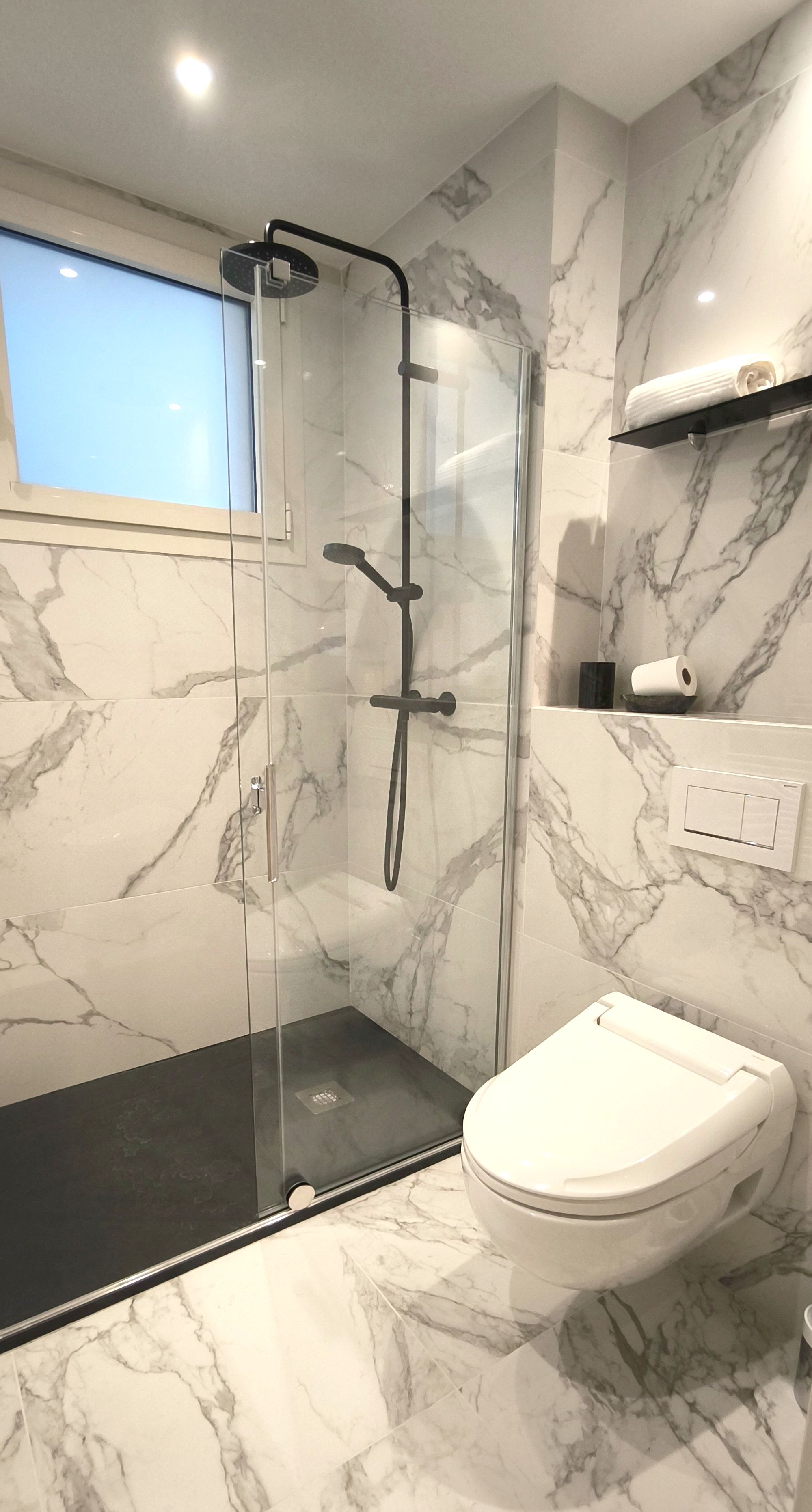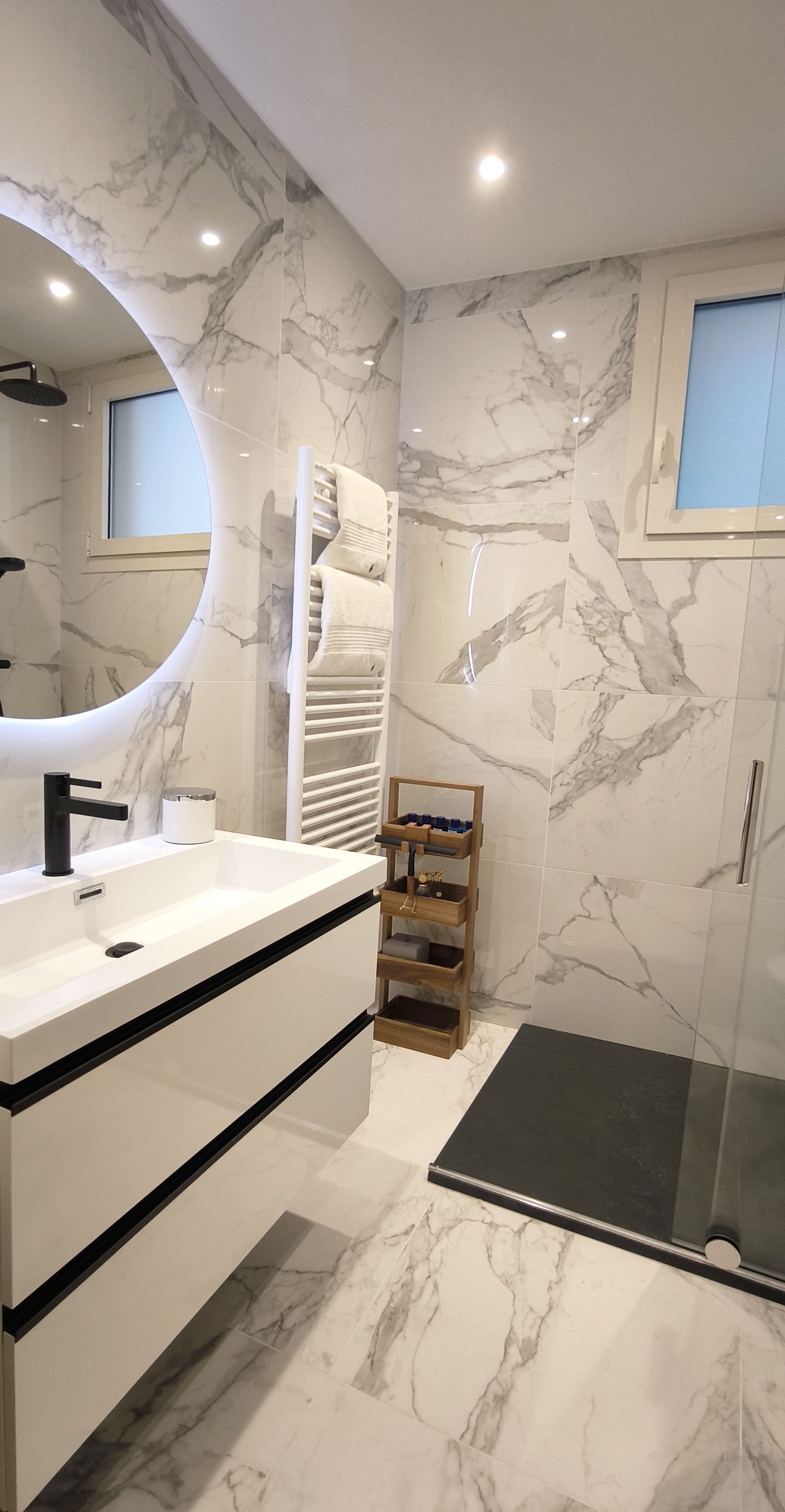 L’espace intérieur se compose d’une entrée, d’un séjour lumineux avec cuisine ouverte entièrement équipée, d’une chambre munie de rangements, ainsi que d’une salle d’eau avec carrelage effet marbre et sèche-serviette, garantissant un confort optimal.