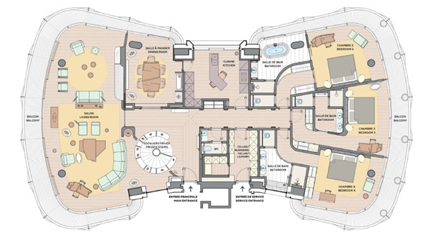 Bénéficiant d'une vue panoramique sur la mer et le Casino, il se compose comme suit: