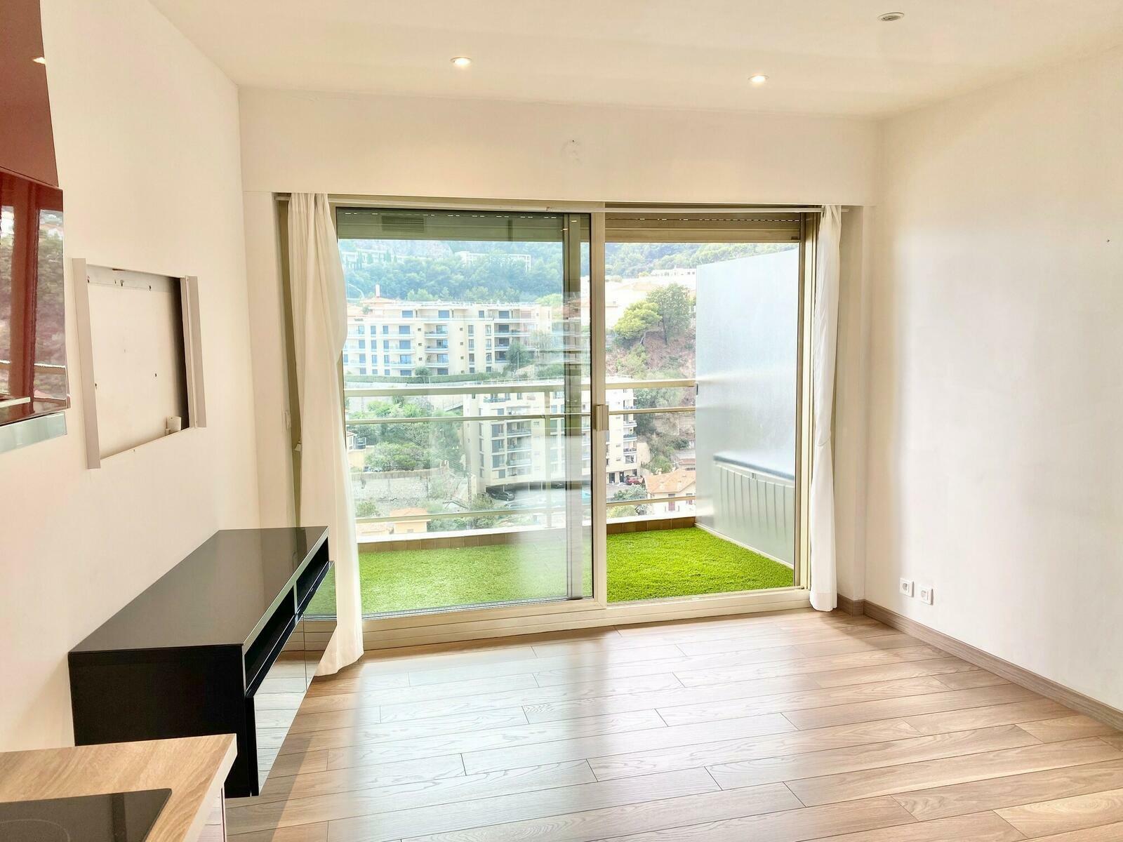 Dans une résidence de grand standing, avec conciergerie 24h/24, magnifique studio entièrement rénové, composé d'un hall d'entrée avec placard, joli cuisine aménagée, pièce principale avec placard mural, salle de douche complète, belle loggia. Climatisation. Très lumineux. Vue mer latérale et montagne. Cave.